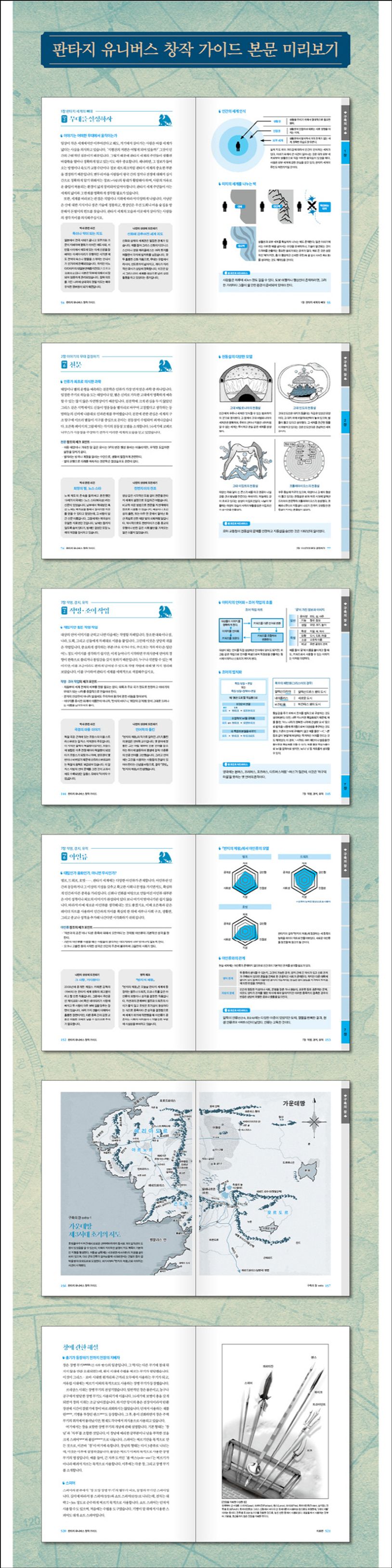 판타지 세계를 구축하는 데 필요한 모든 요소를 담은 『판타지 유니버스 창작 가이드』. 게임, 소설, 만화, 영화 속 자신만의 판타지 세계를 창작하는 예비 작가를 위한 작법서로, 서장 ‘톨킨의 세계’에서 시작해 ‘구축의 장’, ‘환수의 장’, ‘무기·전투의 장’, ‘마법 창조의 장’, ‘자료편’까지 크게 6개 부분으로 구성되어 있으며 내용을 키워드로 상세히 분류했다. 차례를 먼저 살펴보고 필요한 정보가 나오는 페이지부터 읽으면서 해결의 실마리를 찾거나, 일단 처음부터 읽으면서 머릿속에 존재하는 판타지 세계의 윤곽을 그려볼 수 있도록 구성했다.