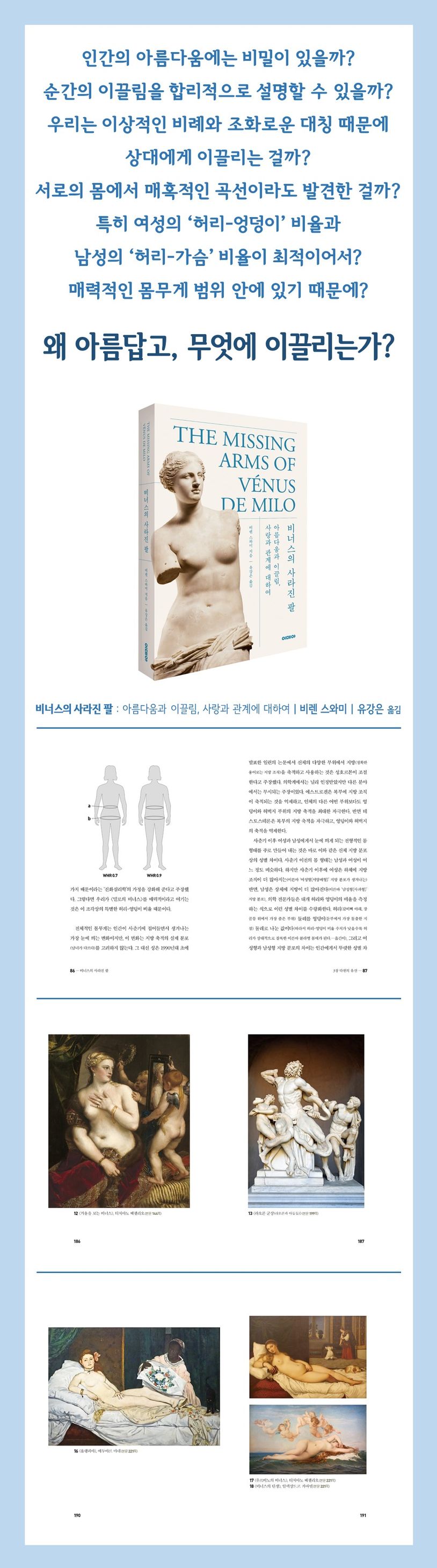 이 책의 저자는 그리스의 작은 섬 밀로에서 두 팔이 사라진 채 발견된, ‘밀로의 비너스’를 동반자로 삼아 이 오래된 논쟁의 역사·과학·사회·문화적 맥락을 관통하는 여정에 나선다. 이 매혹적인 과정에서 우리는 플라톤에서 미켈란젤로, 루벤스에서 마네, 다윈에서 스티븐 제이 굴드, 셰익스피어에서 나오미 울프까지 수많은 철학자와 과학자, 역사가와 비평가, 화가와 작가로 이루어진 인상적인 갤러리를 마주하게 된다.