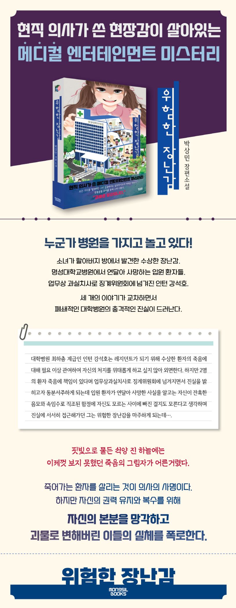 새로운 한 획을 확실히 그었다. 『위험한 장난감』은 보다 엔터테인먼트적인 요소가 많은 작품으로, 일반인들은 잘 알지 못하는 병원 내부의 권력 다툼과 알력 그리고 복수와 배신을 사실적이고 현장감 있게 그려내고 있다.