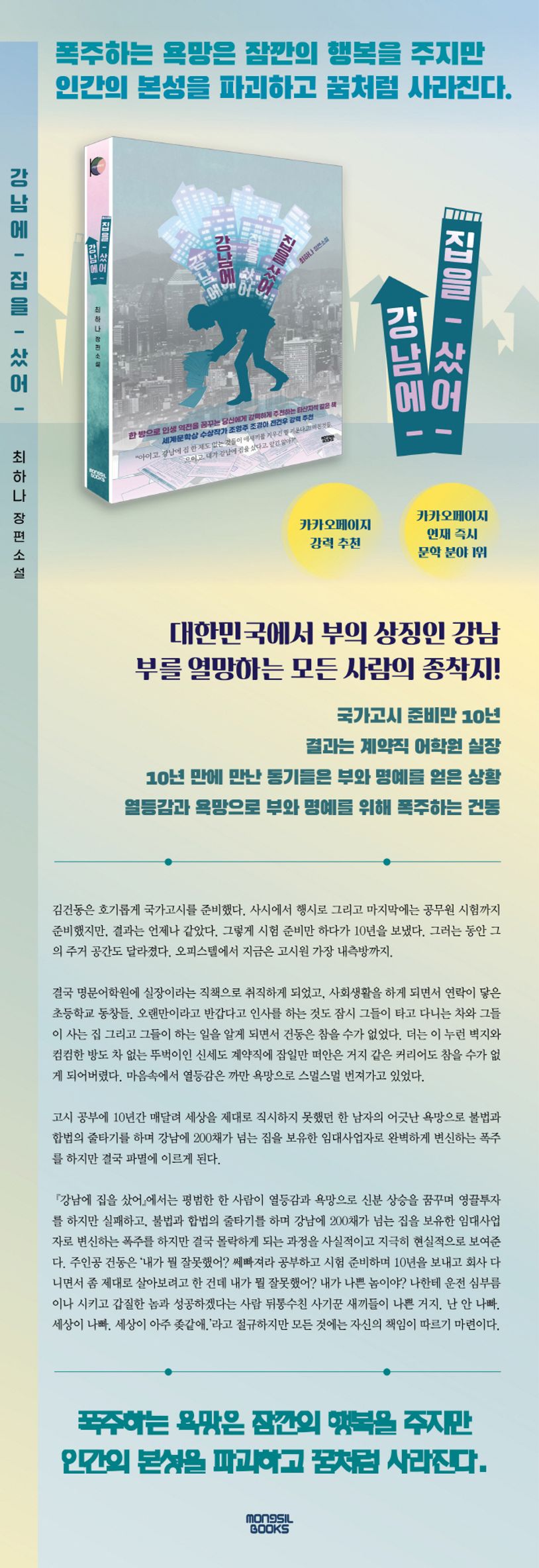 『강남에 집을 샀어』에서는 평범한 한 사람이 열등감과 욕망으로 신분상승을 꿈꾸며 영끌투자를 하지만 실패하고, 불법과 합법의 줄타기를 하며 강남에 200채가 넘는 집을 보유한 임대사업자로 변신하는 폭주를 하지만 결국 몰락하게 되는 과정을 사실적이고 지극히 현실적으로 보여준다. 주인공 건동은 ‘내가 뭘 잘못했어? 쎄빠져라 공부하고 시험 준비하며 10년을 보내고 회사 다니면서 좀 제대로 살아보려고 한 건데 내가 뭘 잘못했어? 내가 나쁜 놈이야? 나한테 운전 심부름이나 시키고 갑질한 놈과 성공하겠다는 사람 뒤통수친 사기꾼 새끼들이 나쁜 거지. 난 안 나빠. 세상이 나빠. 세상이 아주 좆같애.’라고 절규하지만 모든 것에는 자신의 책임이 따르기 마련이다.
