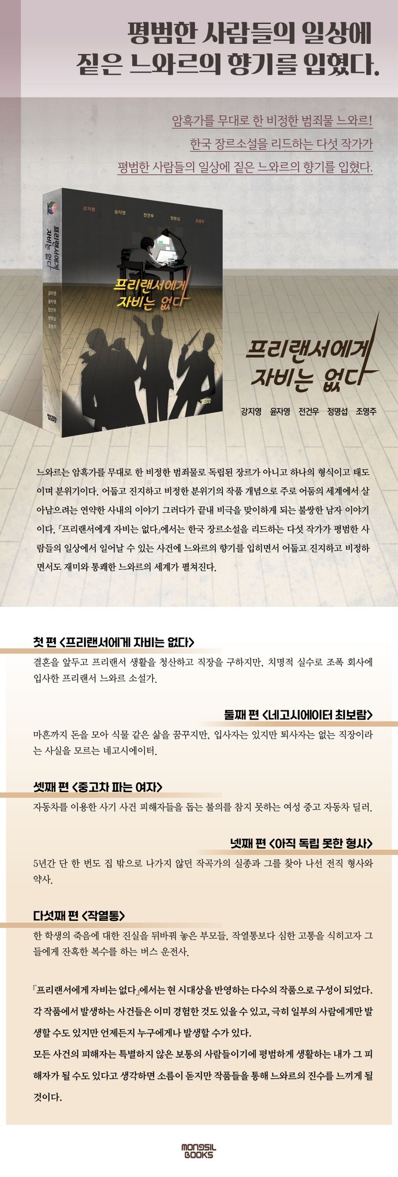느와르는 암흑가를 무대로 한 비정한 범죄물로 독립된 장르가 아니고 하나의 형식이고 태도이며 분위기이다. 어둡고 진지하고 비정한 분위기의 작품 개념으로 주로 어둠의 세계에서 살아남으려는 연약한 사내의 이야기 그러다가 끝내 비극을 맞이하게 되는 불쌍한 남자 이야기이다. 『프리랜서에게 자비는 없다』에서는 한국 장르소설을 리드하는 다섯 작가가 평범한 사람들의 일상에서 일어날 수 있는 사건에 느와르의 향기를 입히면서 어둡고 진지하고 비정하면서도 재미와 통쾌한 느와르의 세계가 펼쳐진다.