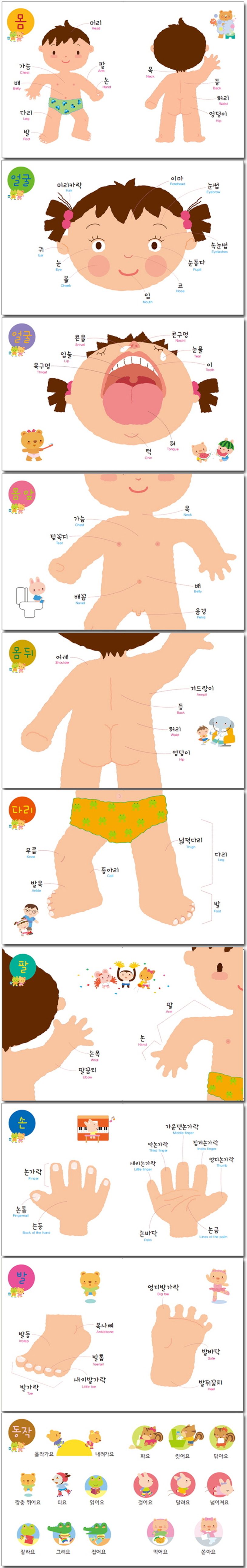이 책에서는 얼굴, 팔, 다리, 그리고 손과 발 등으로 나누어 '우리 몸'에 대해 학습할 수 있다. 아울러 우리 몸과 관련된 단어를 한글과 영어로 익힐 수 있어 어휘력을 발달시키게 된다. 영어 공부에도 유용하다. 귀여운 캐릭터를 등장시켜 집중을 유도한다. [보드북]