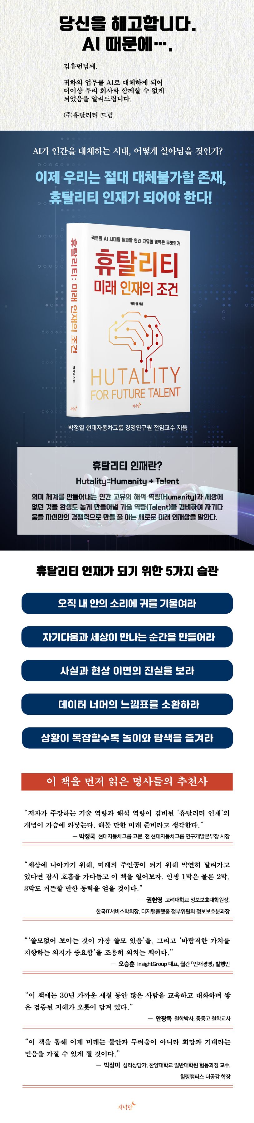 미래 인재에게 필요한 역량은 따로 있다. 미래를 지배할 새로운 의미 체계를 만들어내는 인간 본성인 ‘휴머니티(humanity)’와 탁월한 기술력으로 세상에 없던 것을 완성도 높게 만들어내는 능력인 ‘탤런트(talent)’가 융합된 역량, 바로 ‘휴탈리티(hutality)’가 이루어져야 비로소 우리는 미래와 마주할 주체적 동력을 얻을 수 있다.