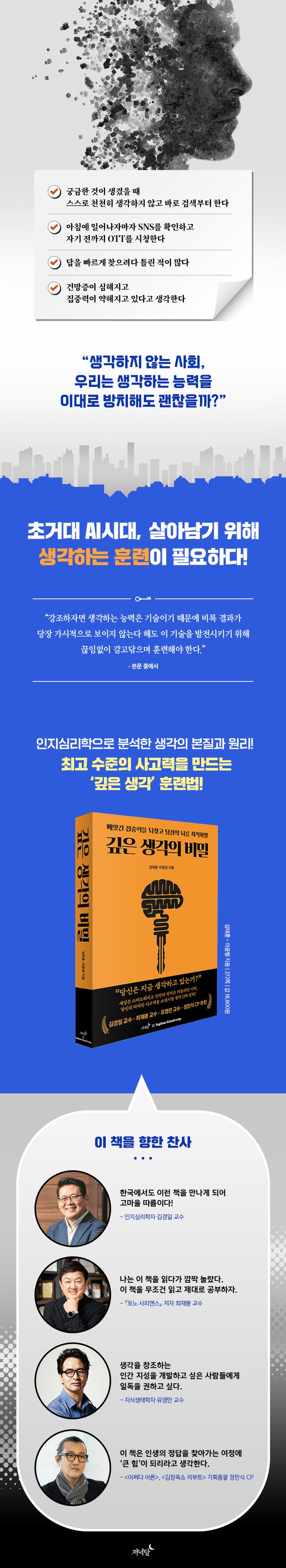 지구상에서 유일하게 생각하는 존재였던 인간은, 또 다른 생각하는 존재의 등장으로 위협받고 있고, 속도와 효율성 면에서 인간을 능가하는 초거대 AI의 등장으로 이미 인간의 일자리는 대체되기 시작했다. 더욱 인공지능을 주체적으로 이용하는 인간으로 살아남기 위해서는 인간이 생각의 작동 방식을 이해하는 것은 그 무엇보다도 중요해졌다.