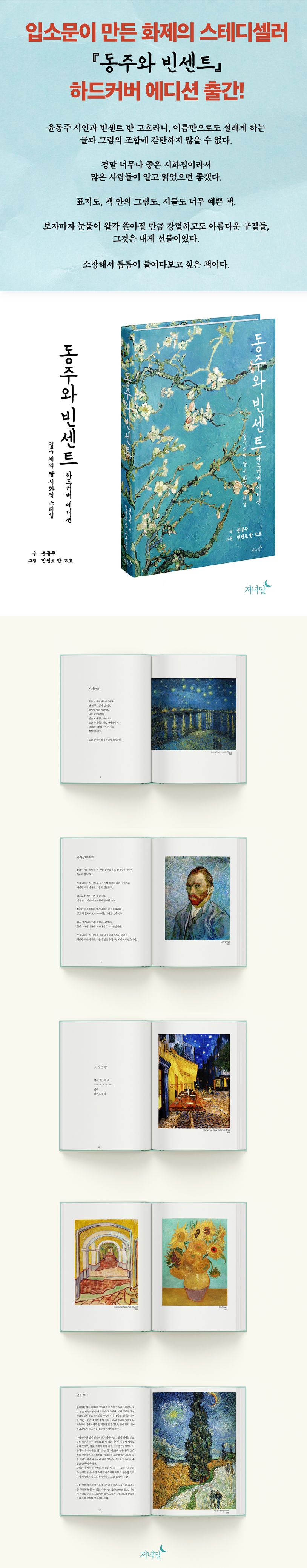 별을 노래한 시인 윤동주의 시 124편과 별을 그린 화가 빈센트 반 고흐의 그림 129점을 함께 묶은 시화집 『동주와 빈센트』가 하드커버 에디션으로 돌아왔다. 『동주와 빈센트』 하드커버 에디션은 고급스러운 각양장 사양으로 제작되었으며, 그림과 시를 더욱 선명하게 감상할 수 있도록 본문 종이를 교체해 인쇄 품질을 더욱 높였다.