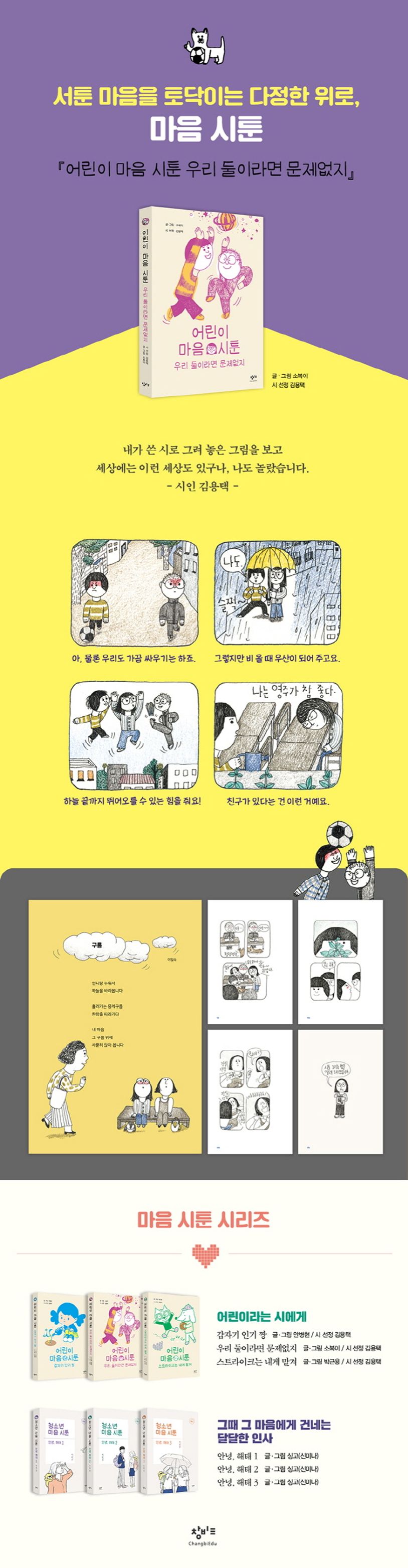‘마음 시툰’ 시리즈는 ‘시를 읽는 새로운 방법이 없을까?’라는 고민에서 시작해 시와 웹툰을 엮어 만든 결과물이다. 힘든 일상에서 서툰 마음으로 상처받는 사람들에게 시와 만화가 다정한 위로가 되기를 바랐다. 그중 ‘어린이 마음 시툰’은 어린이에게 시를 친근하게 만나게 하는 징검다리가 되길 바라는 마음으로 기획한 시리즈이다. 김용택 시인이 초등 국어 교과서 수록 시를 비롯해 어린이들이 읽으면 좋을 시를 정성스럽게 고르고, 안병현, 소복이, 박근용 작가가 각각 시를 읽고 펼친 상상의 나래에 어린이들의 생활과 생각을 녹여 그린 웹툰을 함께 담았다.