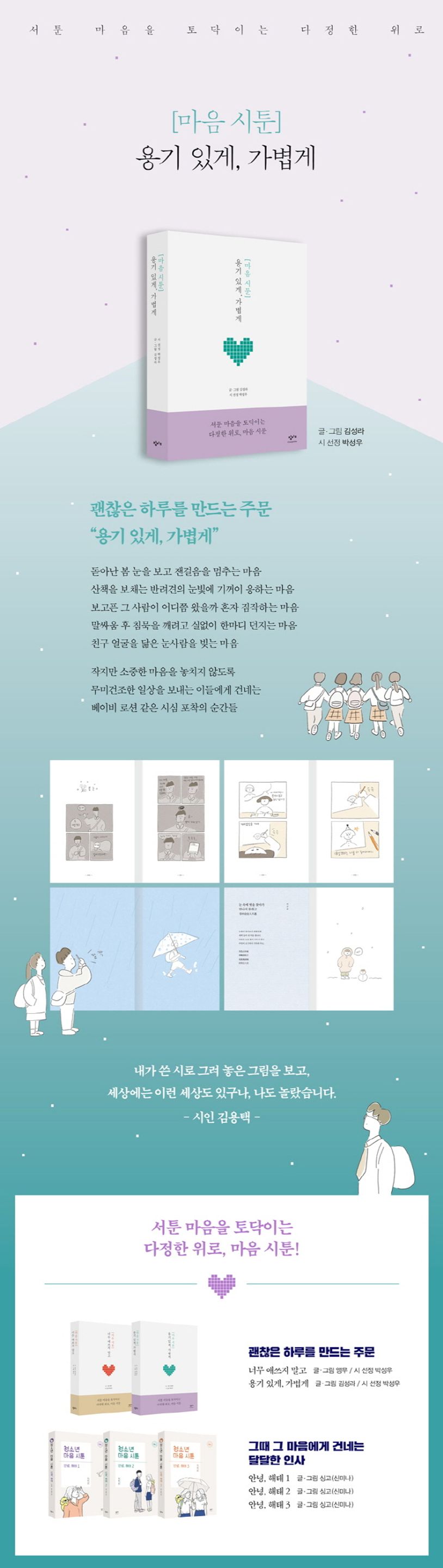 여유 없는 일상을 사는 대중들이 가벼운 마음으로 시를 즐기고 위안을 얻기를 바라는 마음을 담은 ‘마음 시툰’ 시리즈가 출간되었다. 독자들의 일상을 포착하고 대중에게 소개하고자 하는 시를 골라 웹툰으로 재해석해 새로운 시 읽기의 물꼬를 트고자 ‘마음 시툰(詩+Webtoon)’이라는 이름으로 출간된 이 시리즈는 『마음 시툰: 너무 애쓰지 말고』와 『마음 시툰: 용기 있게, 가볍게』 2권으로 구성되어 있다.