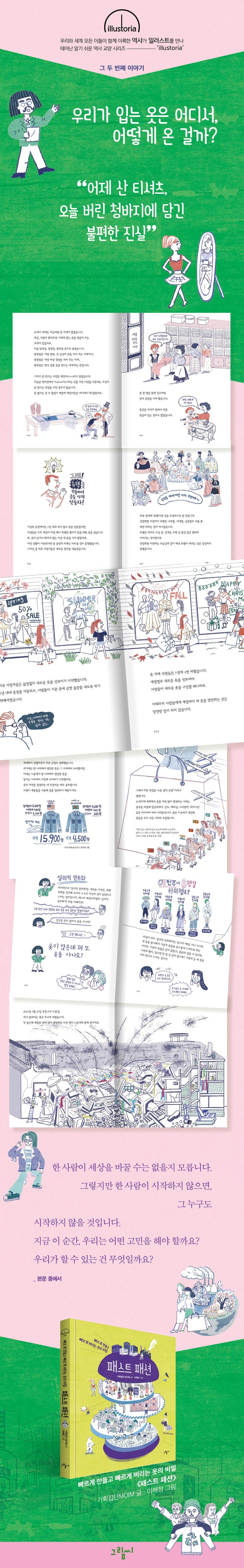 이렇게 탄생한 일러스토리아 시리즈! 첫 번째 책 〈세상을 바꾼 87km, 셀마 대행진〉에 이은 두 번째 책은, 우리가 입고 있는 옷이 어떤 역사와 과정을 거쳐 우리에게 왔는지, 그리고 이 옷 한 벌에 담겨 있는 시사점이 무엇인지를 일깨워 줄 〈빠르게 만들고 빠르게 버리는 옷의 비밀, 패스트 패션〉이다.