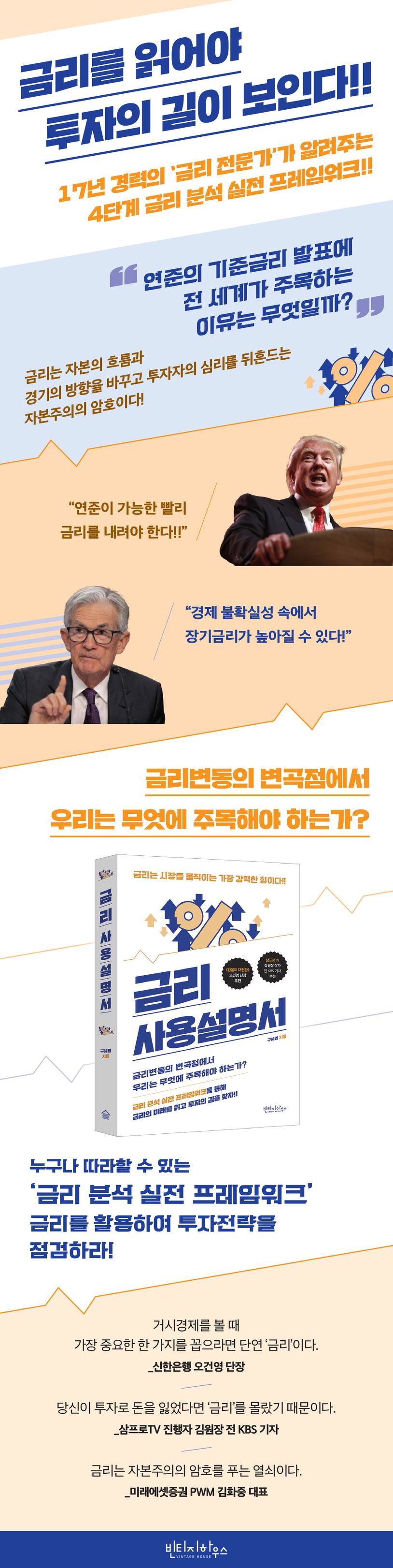 《금리 사용설명서》는 단순한 금리 해설서가 아닙니다. 채권 애널리스트이자 금리 전문가인 저자의 경험과 노하우로 만들어진 ‘금리 분석 실전 프레임워크’를 통해 금리의 미래를 읽고 투자의 길을 찾는 실질적인 가이드를 제시하는 책입니다. 이 책과 함께 금리의 미래를 읽고 투자의 길을 찾기 바랍니다.