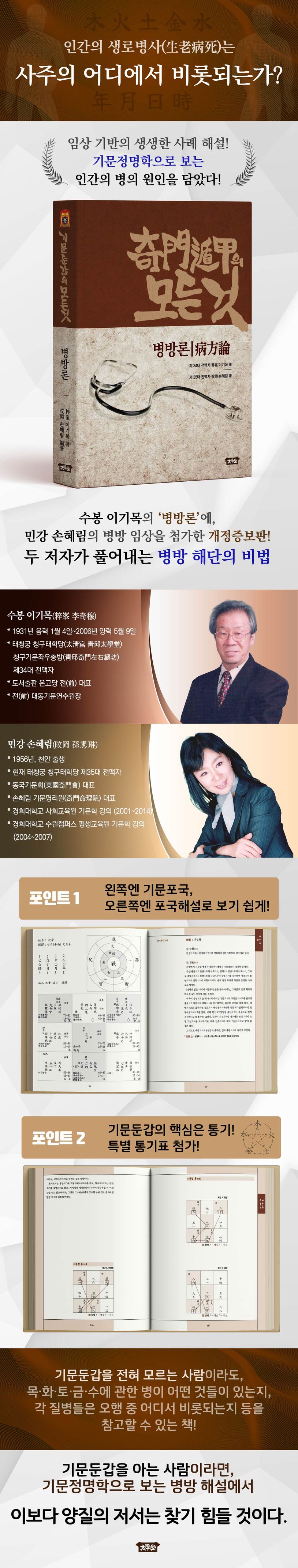 또한 민강 손혜림 원장이 임상 병방과 기문둔갑 기초 지식을 보완하여, 초심자는 물론 기존 연구자에게도 도움이 될 수 있도록 내용을 확장하였다. ‘기문둔갑 사주풀이’에서 다룬 유명 인물 중 병증이 두드러진 사례를 따로 모아 해설한 부분 역시 본서만의 특징이다.