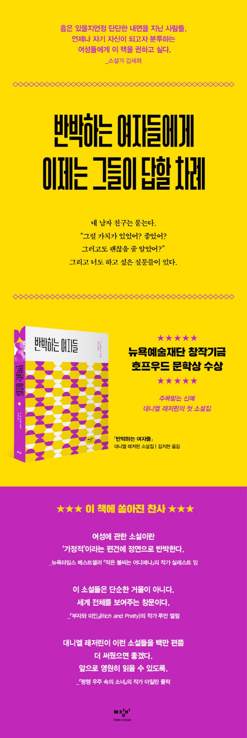 뉴욕예술재단 창작기금, 호프우드 문학상을 수상한 주목받는 신예 대니엘 래저린의 첫 소설집 『반박하는 여자들』. 그간 남성 화자는 한 적 없던, 혹은 할 필요가 없었던 이야기들을 어느 때보다 대담하고 솔직하게, 그래서 더욱 듣고 싶었던 목소리로 담아냈다. 그간 비가시화 되고 납작하게만 그려졌던 여성의 욕망이 얼마나 다종다양할 수 있는지를 일련의 사건과 함께 개연성 있게 펼쳐낸 16편의 소설이 수록되어 있다.