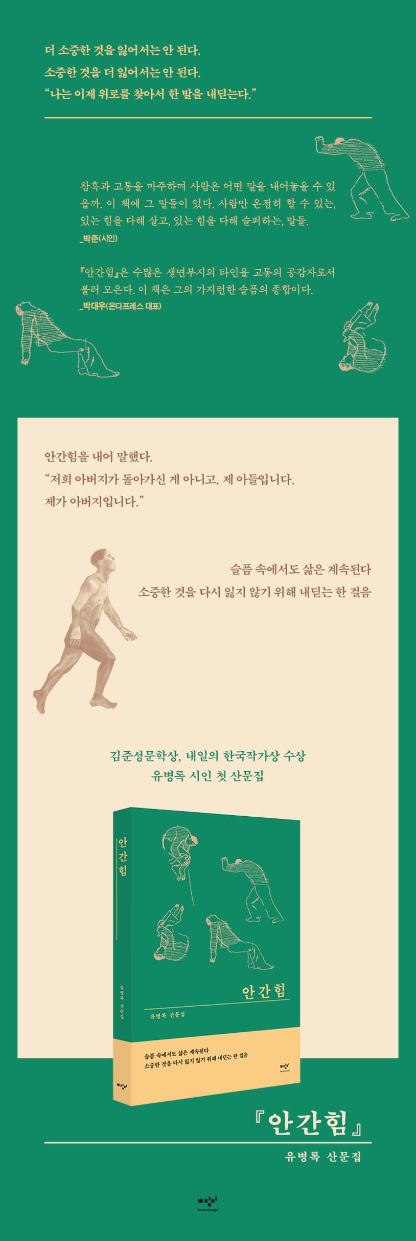 김준성문학상, 내일의 한국작가상을 수상한 시인 유병록의 첫 산문집 『안간힘』이 미디어창비에서 출간되었다. 2010년 동아일보 신춘문예에 당선하며 본격적인 작품 활동을 시작한 시인은 등단 당시 “시선의 깊이, 선명하게 떠오르는 이미지, 서둘지 않고 차분하게 진행되는 묘사력이 탁월”하다는 호평을 받았다. 이 책은 그가 어린 아들을 먼저 떠나보내고 감당하기 어려운 큰 슬픔 속에서 한 글자, 한 글자 안간힘을 내어 써 내려간 치유의 기록이다. 참척의 고통을 겪은 젊은 시인이 “죽음의 힘”으로 살아가겠다는 다짐이 못내 눈물겹다.