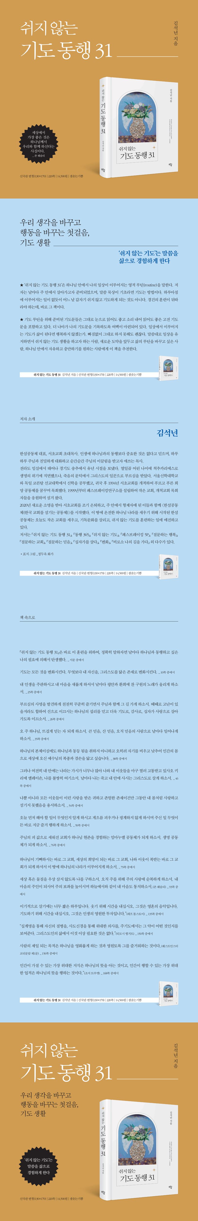 ★ ‘쉬지 않는 기도 동행 31’은 하나님 안에서 일상이 이루어지는 영적 루틴(routine)을 말한다. 날마다 주 안에서 살아가고자 준비된 이 책은 말씀 묵상이 기초라면 기도는 방법이다. 하루아침에 이루어지는 일이 없듯이 어느 날 갑자기 쉬지 않고 기도하게 되는 것도 아니다. 경건의 훈련이 뒤따라야 하는데, 바로 이 책은 그 훈련을 위하여 날마다 하나님과 동행하고 싶은 저자의 필요에 의해서 탄생했다.