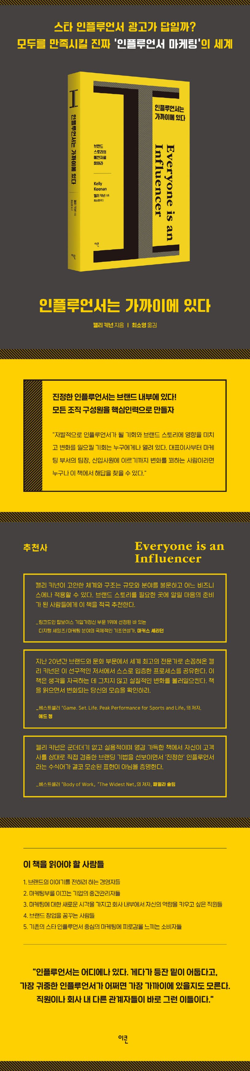 테슬라는 광고비 한 푼 들이지 않으면서 회사를 홍보하는 대표적인 브랜드다. 테슬라 차주들이 알아서 그들의 제품을 알리며 활동하는 하나의 ‘인플루언서 부대’를 형성했기 때문이다. 국내기업 중에서는 대표적으로 LG가 회사의 마케팅팀보다 오히려 소비자들이 나서서 제품의 인지도를 높인 경우다. 이런 경향은 마케팅 대행사 브랜드스토리엑스퍼츠(BSE)의 창립자인 캘리 키넌이 그의 저서 『인플루언서는 가까이에 있다』에서 새롭게 정의한 ‘인플루언서’의 개념을 통해 설명된다. 그간 인플루언서가 단순히 유명한 사람을 뜻한다고 믿었다면 당신네 브랜드는 지천에 널린 인플루언서를 반밖에 활용하지 못한 것이다. 이 시대의 진정한 인플루언서는 브랜드의 메시지를 온전히 이해하고 과장 없이 진실된 이야기를 전할 수 있는, 바로 내부 직원들이다.