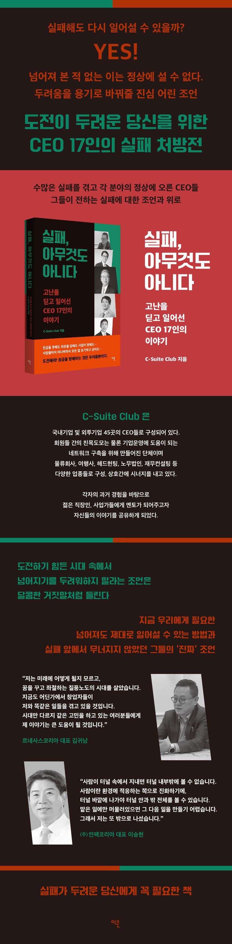 『실패, 아무것도 아니다』는 르네사스 일렉트로닉스 한국 대표이사, 젠하이저 코리아 초대 한국 지점장 등 다양한 산업 군의 여러 CEO들이 겪은 솔직한 실패담을 엮은 책이다. C-Suite Club으로 모인 저자들의 커리어는 다사다난하다. 고등학교 입시 낙방부터 부하 직원이 말없이 그만두는 일까지, 저자들의 이야기는 정말 식은땀이 흐르는 에피소드들로 가득하다. 물론 이 실패를 내세우려고 이 책을 출간하게 된 것은 아니다. 부끄럽지만 자신들의 실패를 통해, 지금도 같은 시련을 겪고 있을 다른 이들이 조금이나마 더 쉽게 극복할 수 있게 하기 위함이다. 자신들의 솔직한 역사를 가감 없이 공유하며, C-Suite Club은 세상에 이 책을 내놓게 되었다