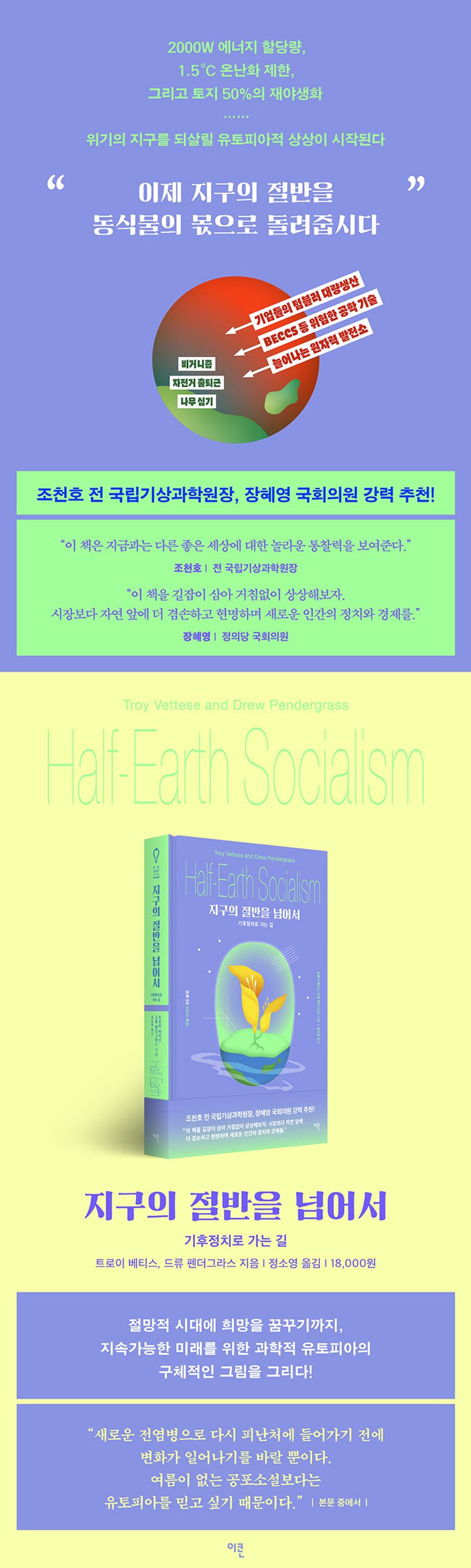 『지구의 절반을 넘어서』는 기후 위기에 맞설 색다른 관점을 선사한다. 바로 절망적 상황에서 유토피아를 상상하는 것이다. 이 책이 주장하는 유토피아란 지구의 절반이 야생으로 돌아간 상태를 말한다. 저자는 통섭의 대가이자 세계적인 석학인 에드워드 윌슨(Edward Wilson)의 ‘지구절반(Half-Earth)’에서 영감을 받아 이 책을 집필했다. 윌슨은 지구의 절반에 인간의 발길을 제한해 다양한 생물종을 확보하지 않는 이상, 인류는 더이상 생존할 수 없을 것이라 경고했다. 하지만 윌슨의 주장은 지구절반을 단순히 환경 문제로 접근하는 한계를 보인다. 지금 우리에게 중요한 것은 이전과는 전혀 다른 삶의 방식을 추구하고, 변화를 일으키기 위해 정치경제 차원에서 대대적인 계획과 조정을 실현하는 것이다. 이제 ‘지구절반 사회주의(Half-Earth Socialism)’를 통해 새로운 가능성의 세계를 그려볼 수 있을 것이다.