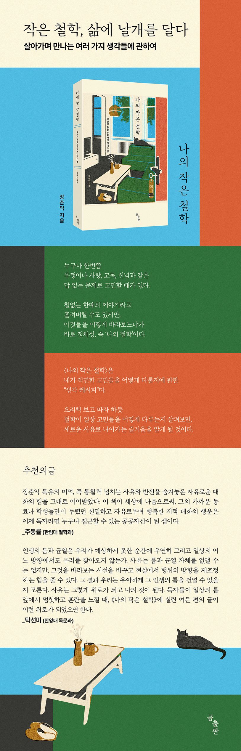 우리는 살면서 수많은 고민에 부딪힌다. 무슨 공부를 해서 어떤 직업을 가져야 할지, 어디서 누구와 함께 살아야 할지. 선택의 순간마다 어떤 결정을 내리느냐에 따라 내가 만나는 세상이 결정된다. 그 모든 순간, 우리가 판단의 기준으로 삼아야 할 것은 오직 ‘나의 철학’이다. 거창한 게 아니다. 내가 소중하게 생각하는 것들을 향해 나아가는 결정이다. 고민의 순간, 나의 생각에 따라 행동하는 과정이 바로 ‘나의 작은 철학’이며 나를 이끄는 힘이다.