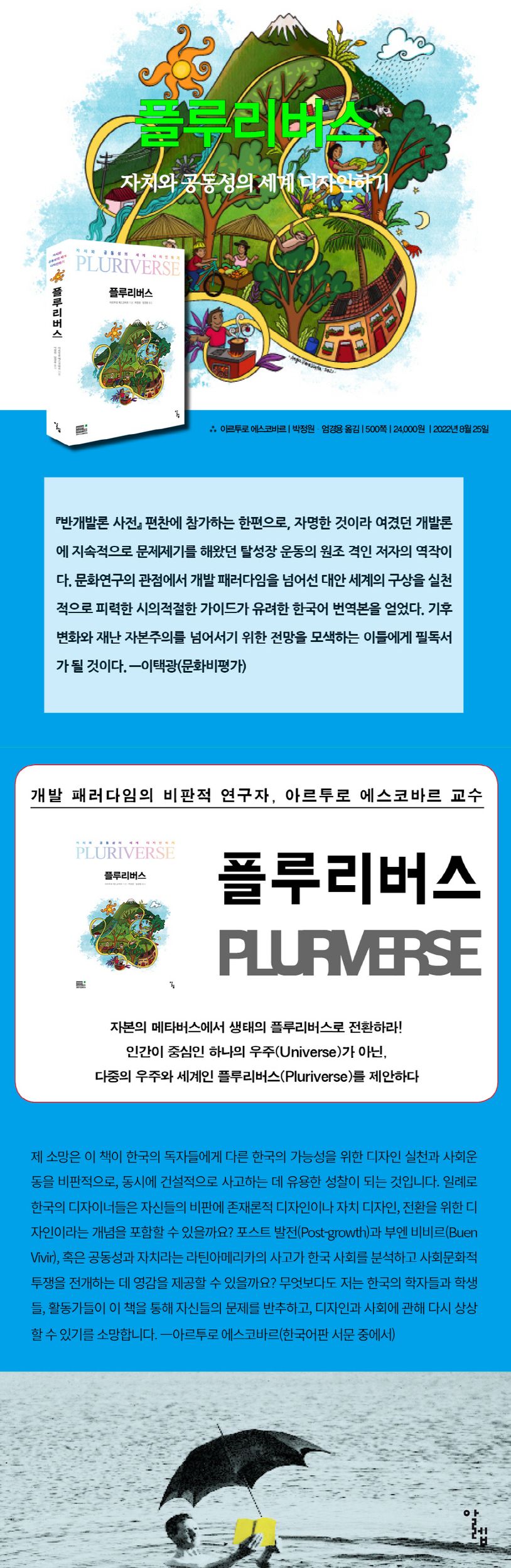 에스코바르는발전주의의도구로서의기술비판을통해기술이이윤의최대화가아닌다른경로를모색해야한다고역설한다.따라서에스코바르는이를넘어설이론과실천을본격적으로탐색한다.이책은그결과물로문명적전환의필요성및대안으로서공동자치의방향과실천경로,즉플루리버스(Pluriverse)를논의한다.