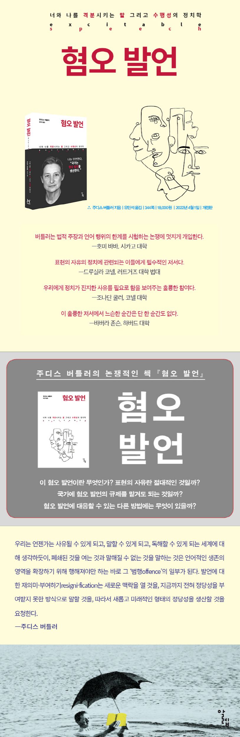 따라서 『혐오 발언』에서 버틀러가 던지는 이런 질문들은 시공간의 차이에도 불구하고 지금 여기 한국 사회의 ‘상처를 주는 말’에 관한 문제에 대해서도 많은 사유들을 제공해 줄 수 있을 것이다. 그렇다면 버틀러는 혐오 발언에 대해 어떻게 바라보고 있으며, 그에 대한 해결책으로 무엇을 제시하고 있는 것일까?