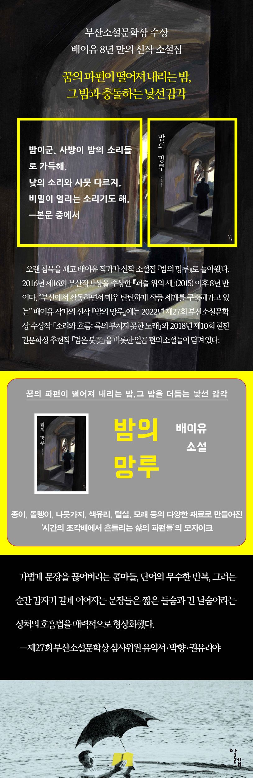 오랜 침묵을 깨고 배이유 작가가 신작 소설집 『밤의 망루』로 돌아왔다. 2016년 제16회 부산작가상을 수상한 『퍼즐 위의 새』(2015) 이후 8년 만이다. “부산에서 활동하면서 매우 탄탄하게 작품 세계를 구축해가고 있는”(《국제신문》) 배이유 작가의 신작 『밤의 망루』에는 2022년 제27회 부산소설문학상 수상작 「소리와 흐름: 록의 부치지 못한 노래」와 2018년 제10회 현진건문학상 추천작 「검은 붓꽃」을 비롯한 일곱 편의 소설들이 담겨 있다.
