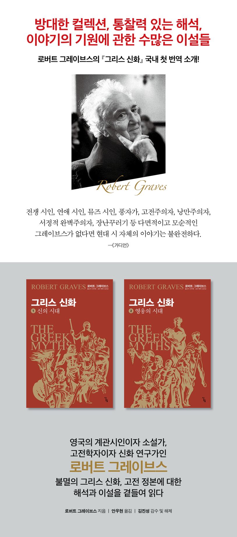 로버트그레이브스의『그리스신화』가현대의독자들이주로읽는‘그리스신화집’인토머스불핀치판,이디스해밀턴판,구스타프슈바브판그리스신화와다른점이있다.그것은,그레이브스가신화의정설뿐아니라‘이형’과‘이설’에도주목하여,이들을폭넓게아우르는신화집을엮어냈다는점이다.그리고여기에그레이브스는자신의독창적인해석을곁들였다.이러한방식의‘신화다시쓰기’가성취한문학적수준은일반적으로찬사를받았다.한편으로,그의독창적인해석이바탕에깔고있는가설은많은고전학자들의비판에부딪히기도했으며,이로인해『그리스신화』는출간이후줄곧논쟁과비판의대상이되어왔다.하지만그는신화에대한해석이다양하고새로울수있으며,신화가인간삶의다양한영역에퍼져있음을보여주었고,『그리스신화』는출간70여년이지난오늘날에도널리읽히는그리스신화집중하나로남아있다.
