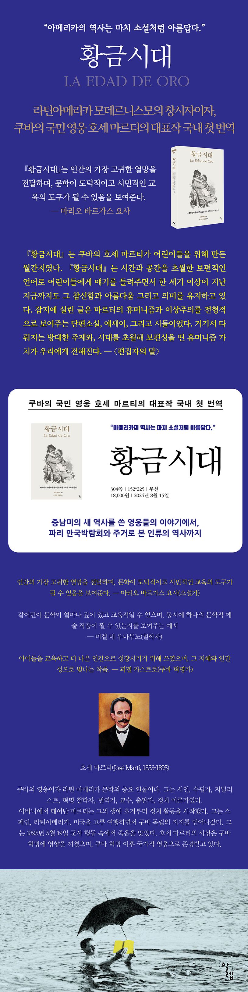 호세마르티(1853~1895)는쿠바의정치가,외교관,시인,수필가,언론인,철학자이며쿠바혁명당의창립자이자독립전쟁의조직자였다.그는쿠바의국민영웅인동시에,라틴아메리카모데르니스모(문학적모더니즘)의창시자로여겨져왔다.호세마르티의자유와독립을향한신념,문화와역사를자각하는정신을담은대표저작인『황금시대』는수많은국가와수많은언어로출판되었고지금도라틴아메리카어린이,청소년을위한고전이되어있다.
