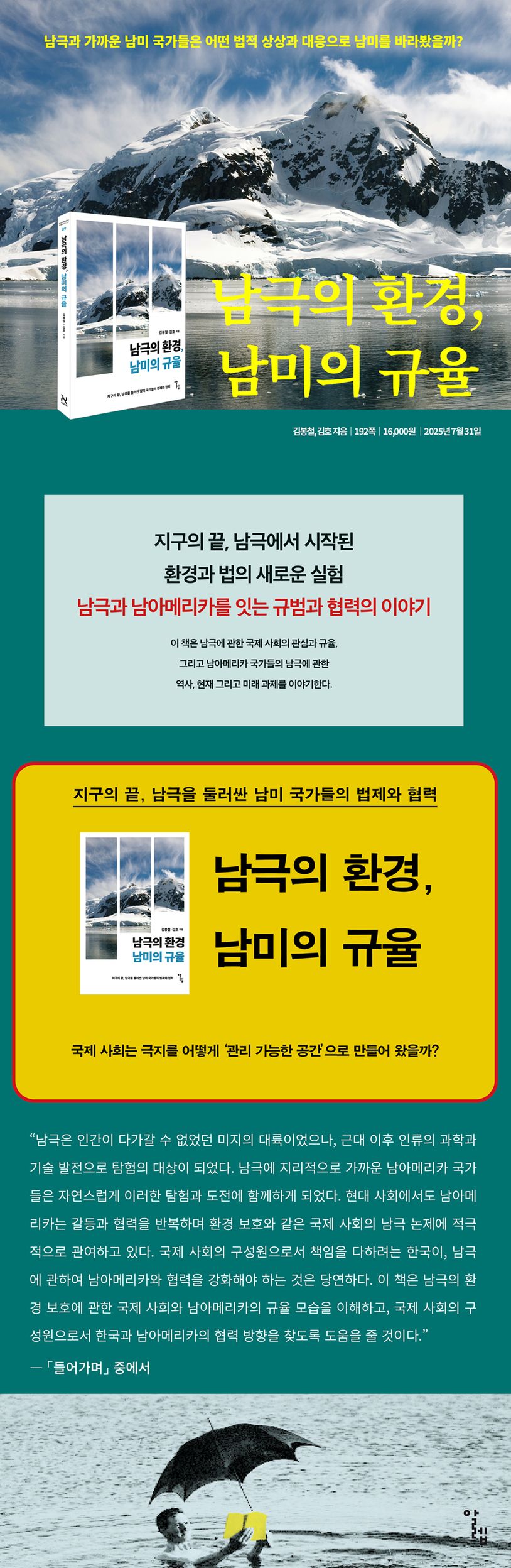 <남극조약>은냉전시기인1959년과학협력과평화적이용이라는가치를명시하며체결되었고,남극을인류공동의공간으로보호하고자한국제사회의첫본격적인법적합의였다.2장「남극에관한규율:남극조약체제」에서저자들은남극을규율하는국제법체계,즉‘남극조약체제’의형성과주요원칙,그리고그이후의발전과정을자세히소개한다.