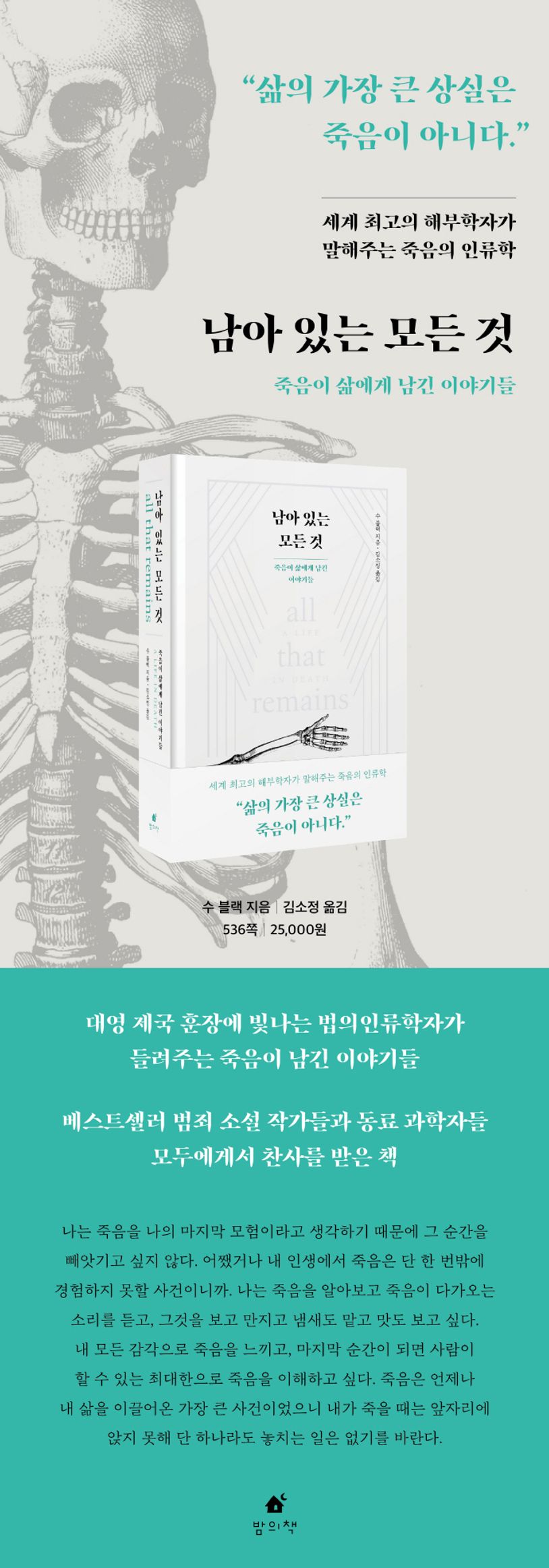 2004년 인도양에 쓰나미가 발생했을 때 사망자 신원 확인에 도움을 주기 위해 태국으로 파견된 최초의 법의학자, 2016년 법의인류학에 공헌한 공로로 대영 제국 훈장을 수여한 수 블랙 교수가 들려주는 죽음과 법의학 세계의 이야기. 『선데이타임스』 베스트셀러를 비롯해 ‘올해의책’, ‘이달의 최고 범죄 도서’, ‘스코틀랜드 내셔널 북 어워드’ 등 각종 타이틀과 문학상을 휩쓸며 베스트셀러 범죄 소설 작가들과 동료 과학자들 모두에게서 찬사를 받은 책이다.