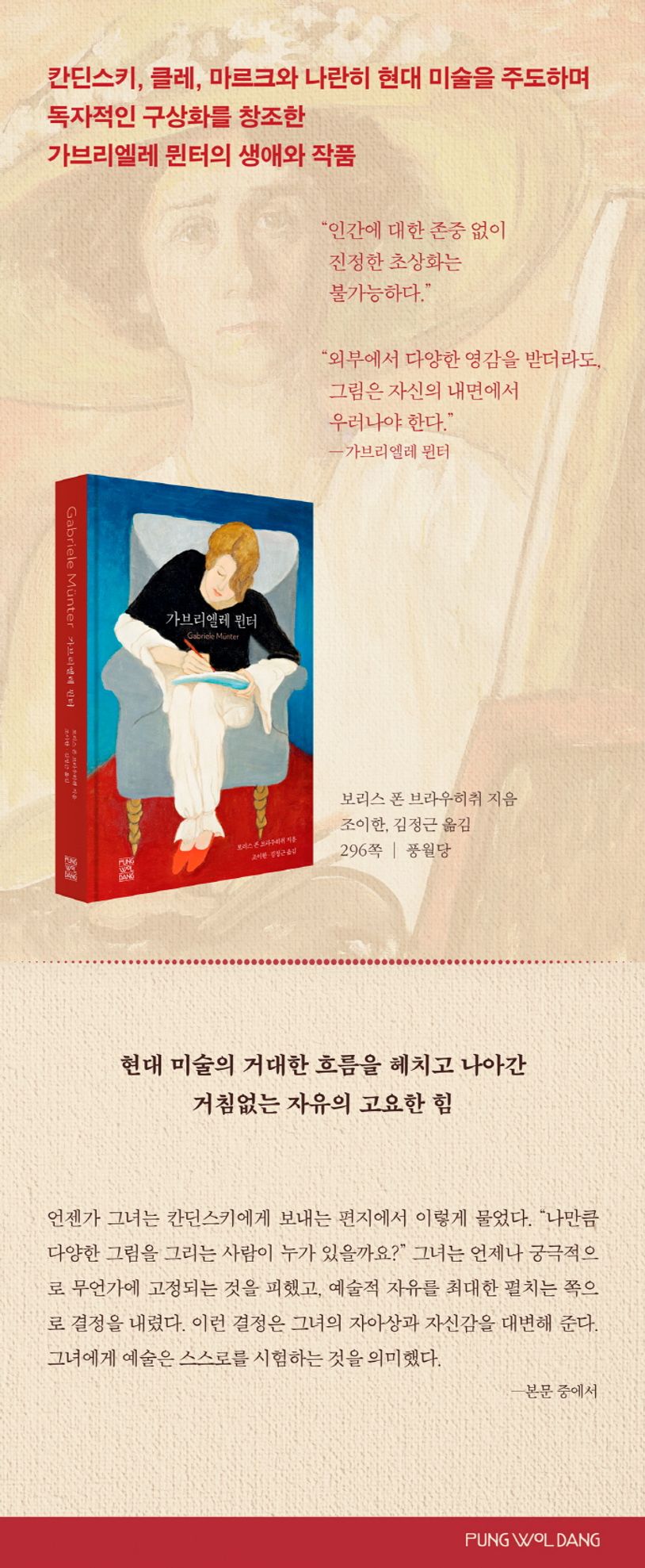 이 책은 가브리엘레 뮌터를 둘러싼 이러한 오해와 부정적인 평가를 걷어 내고, 그녀의 독립적인 삶에 초점을 맞춘다. 그녀는 시대적·인간적 한계 속에서도 묵묵히, 그러나 거침없이 자신만의 방식을 자유롭게 실험했다. 특히 뮌터는 칸딘스키의 제자였던 시기에도 소묘, 사진, 판화에서 그를 뛰어넘는 재능을 보였다. 이 책에 실린 뮌터의 작품들을 보면 특이한 것을 알아보는 안목, 유머 감각, 일상적인 대상과 풍경에 대한 애착을 고스란히 느낄 수 있다. 이 책은 가브리엘레 뮌터가 후대 미술에 끼친 영향을 재평가하고, 이를 통해 그녀가 미술사에서 마땅히 있어야 할 자리를 마련하고 있다.