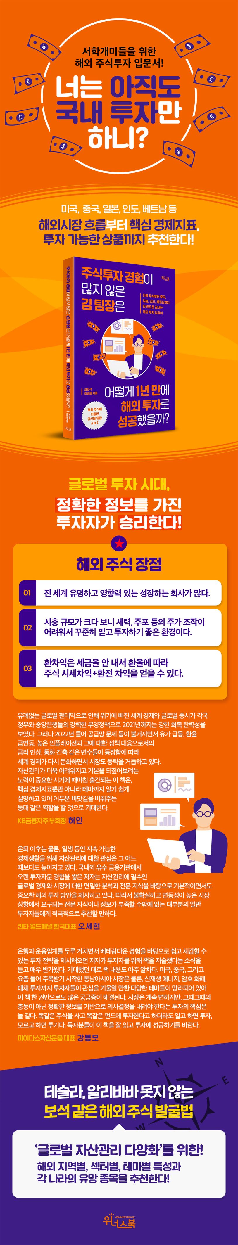 해외시장에 무작정 첫발을 들이려는 초보 투자자들 또는 해외 주식에 먼저 투자했지만 진전이 없는 투자자들은 이 책을 도움의 발판으로 삼는다면, 자신만의 포트폴리오를 구성하고 해외 주식시장에서 성공적으로 살아남을 수 있을 것이다.