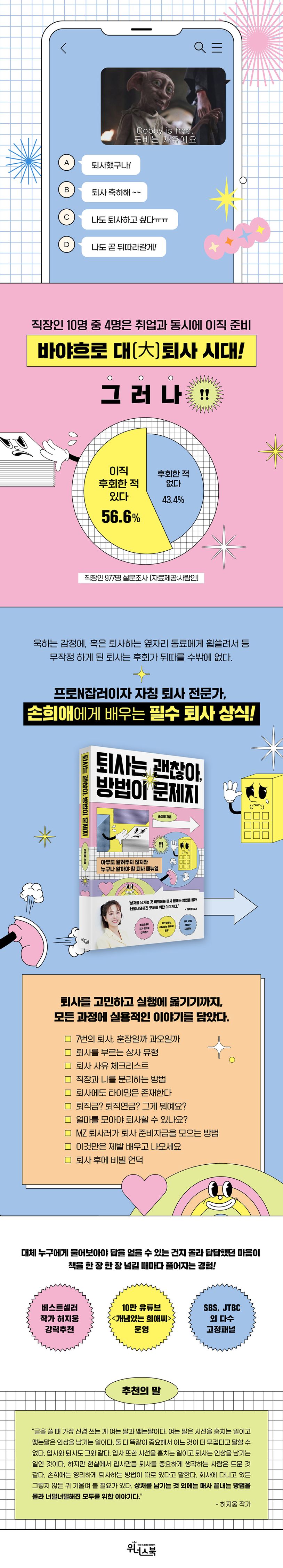 『퇴사는 괜찮아, 방법이 문제지』는 이러한 시대에 꼭 필요한 내용을 담았다. 후회 없는 퇴사를 위해 충분한 고민의 시간을 마련해줌과 동시에, 마침내 퇴사를 결정했다면 준비해야 할 것과 주의해야 할 것에 대해서 차근차근 설명해준다. 이 책의 저자 손희애는 실제로 7번의 퇴사를 경험한 자칭 퇴사 전문가이다. 그녀가 체득한 퇴사 노하우가 온전히 담긴 이 책은 한 번이라도 퇴사를 꿈꾼 직장인들에게 “대체 누구에게 물어보아야 답을 얻을 수 있는 건지 몰라 답답했던 마음이 책을 한 장 한 장 넘길 때마다 풀어지는 경험”을 선사할 것이다.