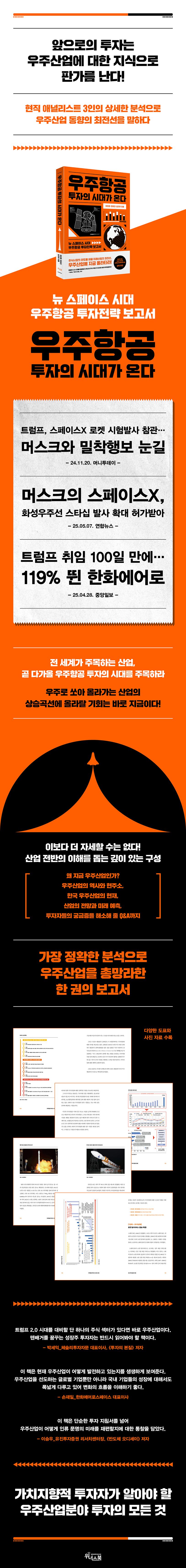 연일 최고의 주가를 갱신하고 있는 우주산업 분야를 분석한 투자서가 위너스북에서 출간되었다. 트럼프 2.0 시대를 맞이하며 투자자들은 앞으로 4년, 어떤 산업에 주목해야 할지 알아봐야 할 때다. 일론 머스크의 스페이스X를 필두로 민간 우주산업의 시대가 열리고 있다. 이 책은 현 세계정세를 짚으며 우주산업이 과거로부터 어떻게 발전해왔고 현재 어떤 지점을 지나고 있는지, 앞으로의 발전 방향은 어떠할지를 체계적으로 분석했다. 다양한 분야에서 베스트애널리스트로 선정된 바 있는 현직 애널리스트 3인이 다양한 도표와 그래프, 사진 자료와 함께 산업의 최신 동향을 설명한다. 이미 활발히 산업이 진행되고 있는 해외와 더불어 전도유망한 국내 우주산업의 현주소를 파악하고 어떤 기업들이 어떤 개발을 진행하고 있는지, 투자 전망은 어떠한지 알아볼 수 있다. 산업의 시작과 현재, 미래 그리고 그 실제는 어떠한지를 낱낱이 담은 국내 유일의 책이다. 전문가들의 심도 있는 분석으로 완성된 이 책을 통해 투자자들은 일반 투자자가 쉽게 접근할 수 없었던 기업 정보와 산업에 대한 통찰을 얻을 수 있을 것이다.