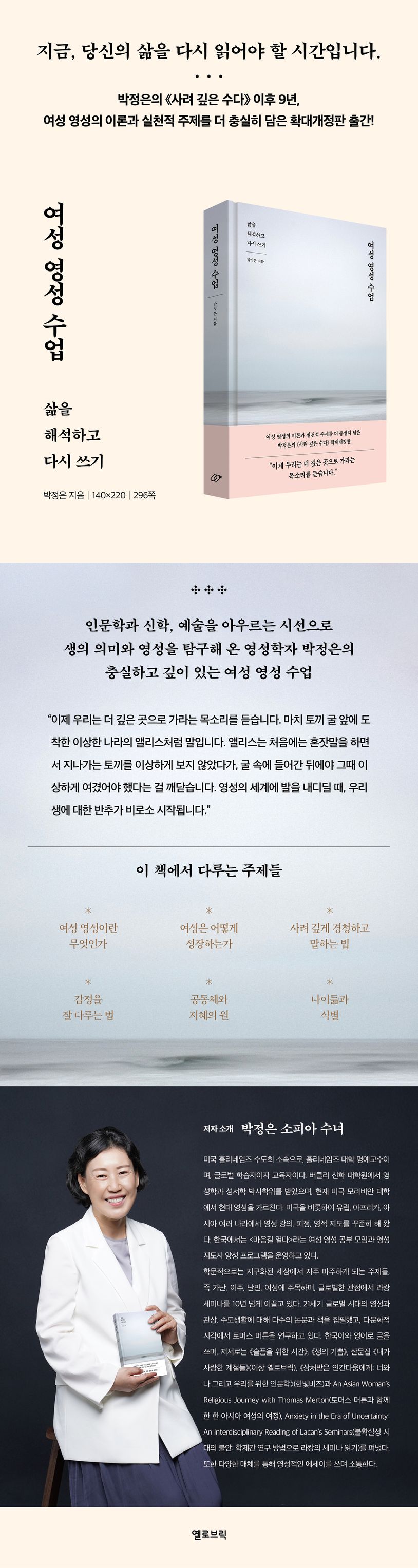 확대개정판으로 선보이는 《여성 영성 수업》은 《사려 깊은 수다》의 내용을 바탕으로 신비주의, 식별, 노년과 죽음 등 삶의 후반부를 아우르는 주제를 더했으며, 여성의 영적 성장 과정과 다양한 일상의 텍스트를 통해 삶을 해석하는 방법 등을 정리하여 여성의 내면 여정을 관통하는 본격 영성 교과서로 완성하였습니다.