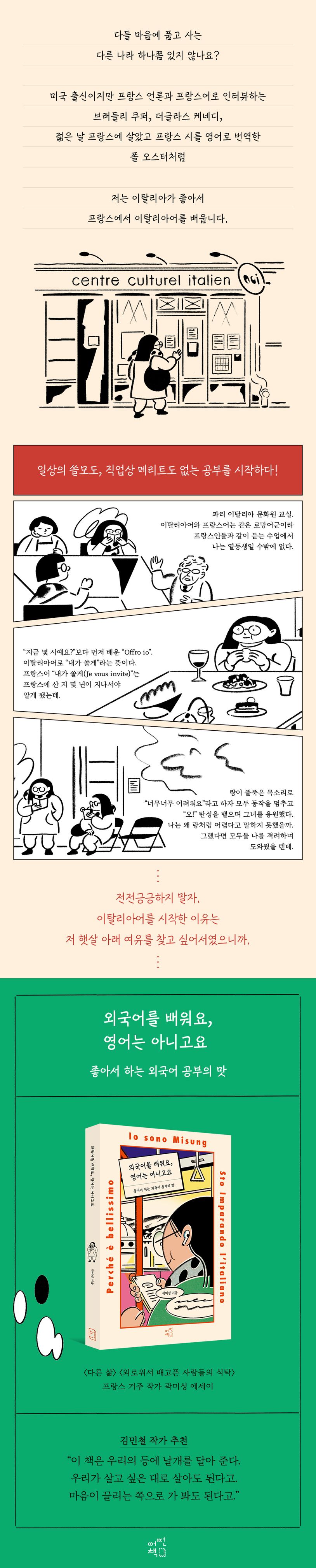20년 넘게 프랑스에서 살며 프랑스어 실력에 따라 삶이 크게 요동치는 시간을 보낸 곽미성 저자는 프랑스어를 자유롭게 구사하는 지금 이탈리아어를 배우기 시작한다. 한국 사람이 프랑스에서 이탈리아어를 배우는 이야기가 시작되는 것이다. “외국어 공부란, 신화 속 형벌 같다”고 말하는 저자가 왜 또다시 산꼭대기로 끊임없이 바위를 밀어 올려야 하는 시지프가 되기로 한 것일까.