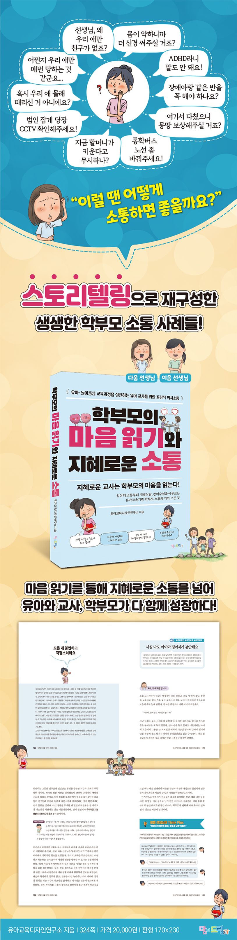 유아교육기관에자녀를맡긴부모는어린자녀와처음으로오랜시간떨어져지내며,일거수일투족을지켜볼수없다는이유만으로도불안하고걱정스러운것투성이다.특히외동이가많아진요즘자녀가교육기관에머무는시간을마치위험한물가에라도내놓은양전전긍긍하기도한다.아토피나천식,알레르기등몸이아픈아이에대한걱정,소심한성격에따돌림을당할까걱정,체구가작아서걱정,반복되는문제행동에대한걱정,혹시내자녀만불이익을당하지않을까등등걱정이이만저만이아니다.이런걱정과불안의뿌리는결국자녀에대한깊은사랑에서비롯된것이겠지만,때론교사의고단함으로이어지기도한다.다움선생님도시도때도없이연락한다거나,불안과걱정이커진나머지시시콜콜의심의눈초리마저보내는학부모들을만나는데,이들에게어떻게적절한지원을해줄지고민이다.이음선생님은이런학부모의불안한속마음을읽고,지혜로운소통방법을제안한다.