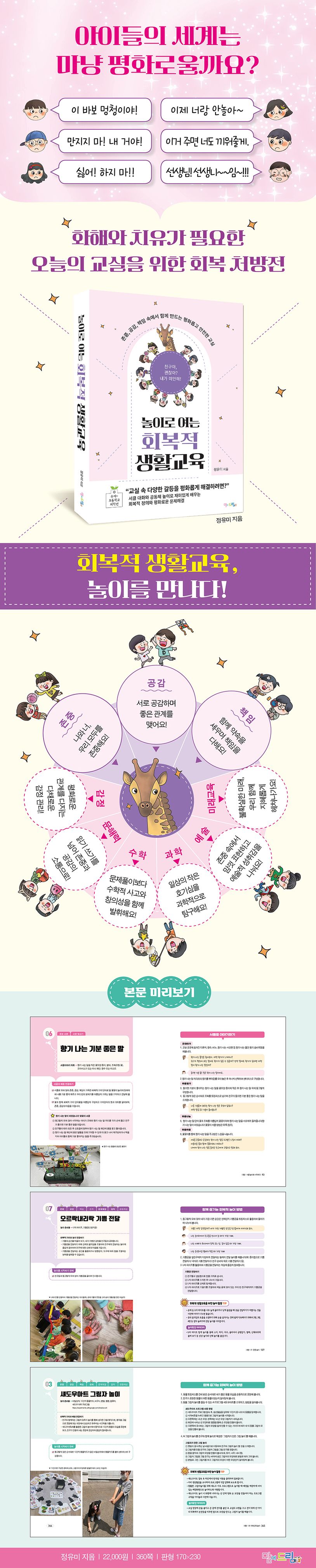 사회 전반에 갈등과 폭력이 난무하는 가운데 교육 현장도 예외는 아니다. 학생은 물론, 학부모까지 복잡하게 얽히고설킨 온갖 갈등과 괴롭힘, 폭력 속에서 교사들의 시름도 날로 깊어지고 있다. 이 책은 평화가 절실한 오늘의 교실에 회복적 생활교육을 통한 화해와 치유의 길을 안내한다. 다만 일회성 지도가 아니라 교실에서 아이들과 함께 일상적으로 꾸준히 적용해 볼 수 있도록 재미있는 놀이를 매개로 풀어간다. 무엇보다 발달 특성상 유아부터 초등학교 저학년에 대한 회복적 생활교육은 어렵다는 편견을 깨고, 서클 대화와 공동체 놀이를 기반으로 존중, 공감, 책임 등 주요 회복적 가치를 아이들이 자연스럽게 내면화하도록 돕는다. 나아가 재미 추구를 넘어 감정, 문해력, 수학, 과학, 예술, 미래교육 등 의미 있는 배움을 회복적 가치와 연결하는 놀이들도 함께 담았다. 교사 홀로 외롭게 모든 문제의 해결사 역할을 짊어지는 대신, 함께 힘을 모아 교실에 지속가능한 평화의 뿌리를 내리기 위한 해법을 발견할 수 있을 것이다.