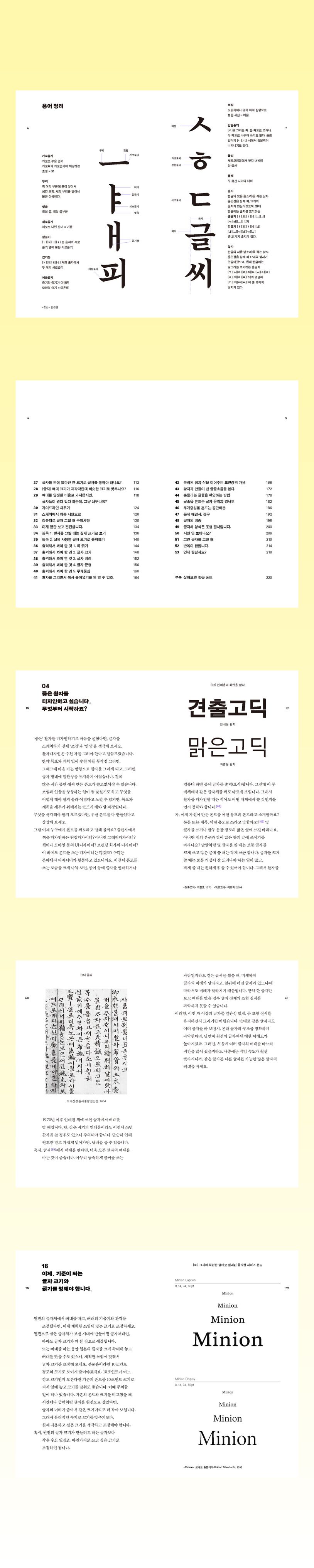 이 책은 20년 가까이 한글 디자인을 가르쳐 온 교육자 그리고 한글 디자이너 이용제가 학생들을 가르치며 가장 자주 들었던 질문과 작업을 지도하며 아쉬웠던 점 그리고 꼭 알아야하는 점을 정리해 엮은 것이다. 한글 디자인은 아직 이론이 정립되지 않았다. 이것은 교육자와 학생 모두 부담이다. 이 책은 이론을 정리하거나 이 책만으로 한글 활자를 디자인 할 수 있다고 말하지 않는다. 단지 이용제의 경험을 바탕으로 한글 디자인의 모호함을 조금이라도 걷으려고 노력한다.
