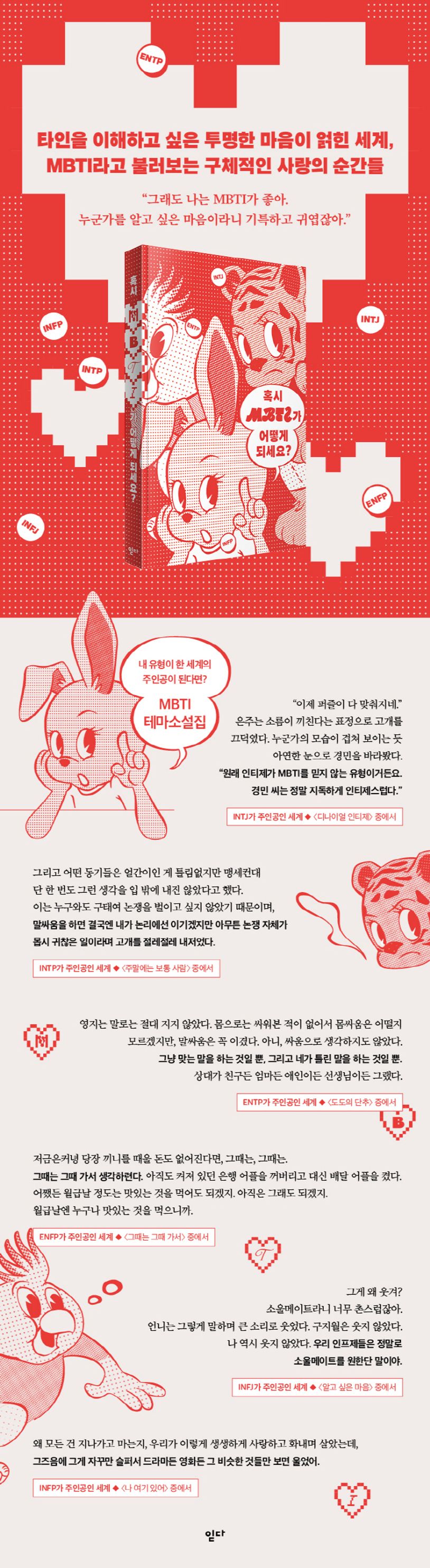 우주 최초 MBTI 소설집. 16가지 인물 유형을 모두 담기 위해 세 권으로 기획한 이번 테마소설집 시리즈는 한 명의 소설가가 하나의 MBTI 유형을 택해 인물의 면면을 그린다. 1권 《혹시 MBTI가 어떻게 되세요?》는 여섯 명의 소설가가 각각 INTJ, INTP, ENTP, ENFP, INFJ, INFP 유형의 인물을 묘사한다.