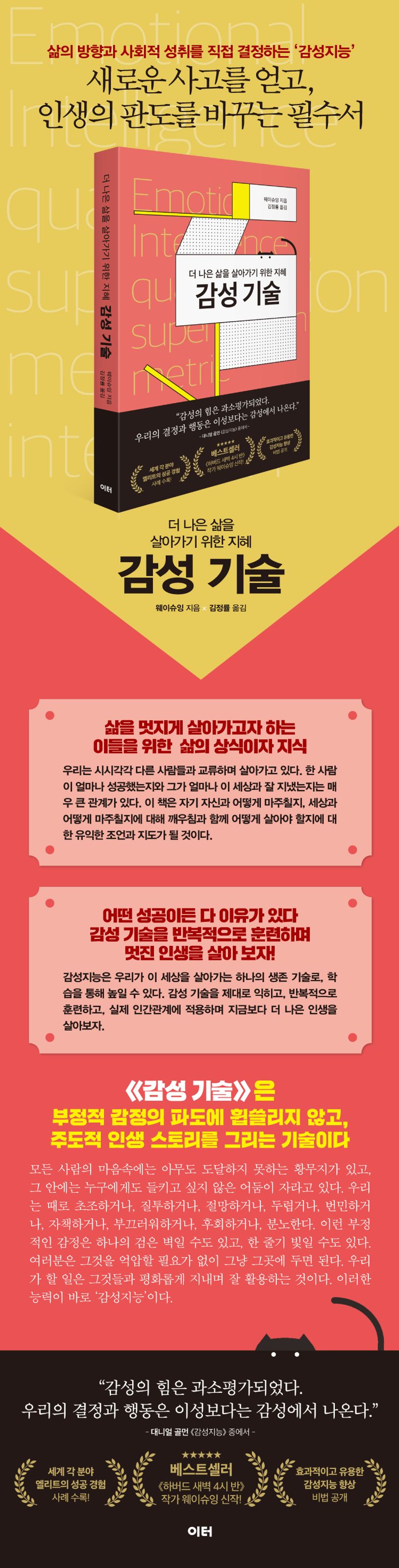 감성지능은 우리가 이 세상을 살아가는 하나의 생존 기술로, 학습을 통해 높일 수 있다. 감성 기술을 제대로 익히고, 반복적으로 훈련하고, 실제 인간관계에 적용하며 지금보다 더 나은 인생을 살아보자!