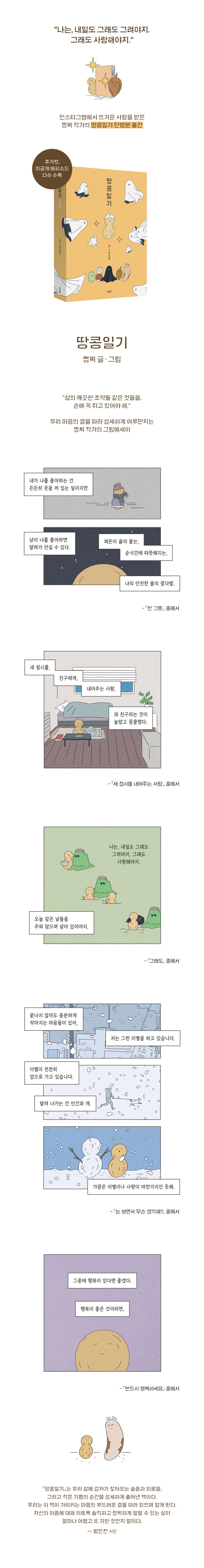 『땅콩일기』는 작가 쩡찌가 ‘땅콩’을 통해 일상에서 겪는 마음의 일들을 진솔하게 담아낸 그림일기다. 땅콩일기는 2019년부터 인스타그램을 통해 연재, 2만 8천 명이 넘는 독자들의 열렬한 사랑을 받으며 지금 이 순간에도 연재되고 있다. 이번 단행본은 2019년부터 2021년까지 연재된 작품 중 독자들의 사랑을 받은 에피소드를 엄선하고 완전히 새롭게 편집해 선보이는 소장판이다. 이에 더해 추가컷, 미공개 에피소드 등을 다수 담아내어 독자들의 곁에 다가간다.