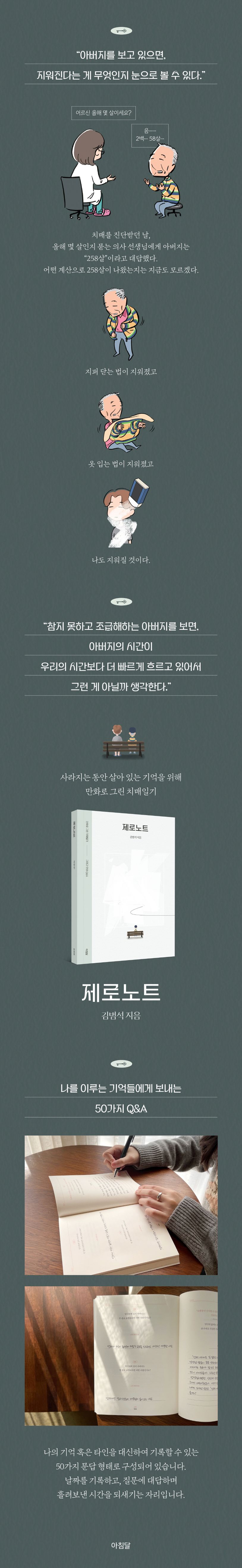 작가는 치매 환자인 아버지와 함께 살아가면서 겪고 느낀 수많은 장면을 담담한 태도로 그려낸다. 함부로 감정을 호소하지 않고, 있는 그대로의 순간을 사실적으로 마주하여 그린 만화를 트위터에 연재했을 당시 많은 독자의 공감과 응원을 받기도 했다. 우리 기억의 일렁임 속으로 질문을 던지는 작가의 이야기는 누군가의 특별한 이야기가 아니라 우리 모두의 이야기로 다가온다. 아들로서의 자아를 앞세우지 않고, 오롯이 아버지의 깜빡이는 순간들을 담백하게 기록했기 때문이다. 이 책은 한 사람이 알츠하이머로 인해 기억을 소진해가는 과정으로서의 ‘제로’가 아니라, 타인을 기억하는 동안, 기억 속에서는 얼마든지 재회할 수 있고 함께할 수 있다는 무한한 가능성으로서의 ‘제로’로 재구성된다.