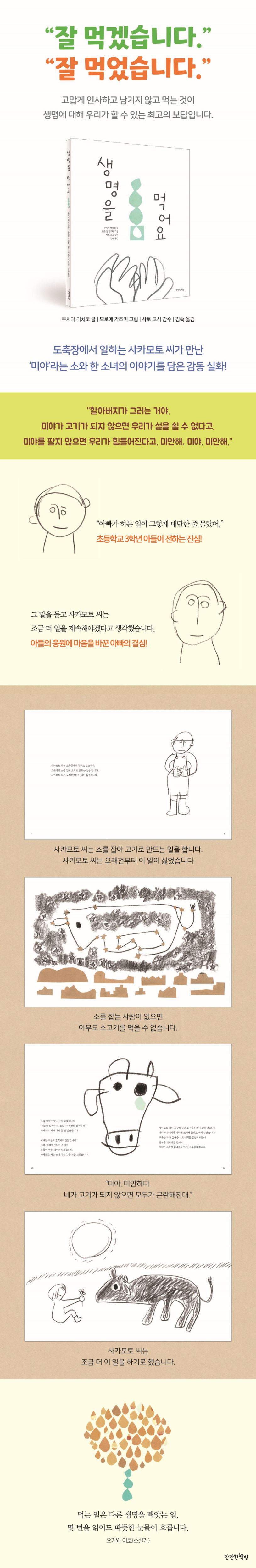 〈생명을 먹어요〉는 도축장에서 일하는 사카모토 씨의 실제 이야기를 바탕으로 쓰인 이야기다. 조산사로 오래 일하며 ‘탄생의 숭고함과 생명의 기적’을 경험한 작가는 그 감동을 전하기 위해 많은 학교를 돌며 강연하던 어느 날, 우연히 사카모토 씨의 이야기를 듣고, 그때 받은 감동을 잊을 수 없어 이 책을 쓰게 되었다고 한다.
