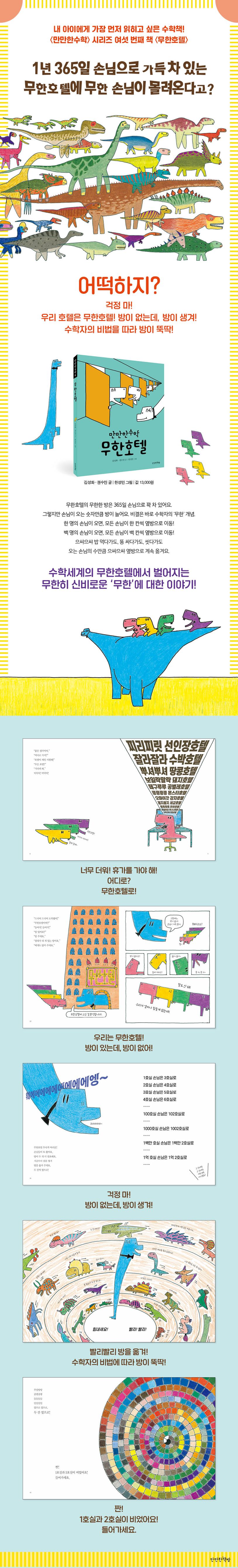 〈만만한수학〉 시리즈에서 계속 호흡을 맞춰 온 김성화, 권수진 작가와 한성민 화가가 힐베르트의 수학적 무한호텔을 소재로 수학 그림책을 만들었다. 수학적 깊이가 내재된 탄탄한 글과 아이디어 넘치는 귀여운 그림이 조화를 이루어 아이들의 수학적 호기심을 자극한다.