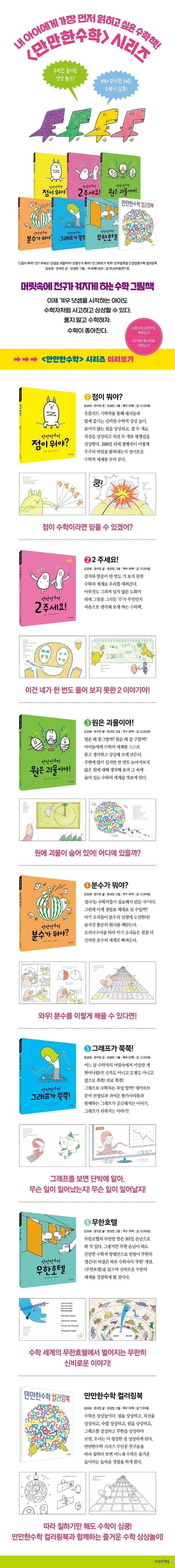 아이도 수학자처럼 꿈꾸고 생각할 수 있다는 걸 보여 준 『만만한수학』 시리즈 컬러링북이 출간되었다. 수학은 상상놀이다. 점을 상상하고, 직선을 상상하고, 수를 상상하고, 원을 상상하고, 그래프를 상상하고 무한을 상상하다 보면, 우리는 더 굉장한 걸 상상하게 된다. 만만한수학 시리즈 각 권의 귀엽고 엉뚱한 주인공 친구들의 수학적 질문을 따라 한 장 한 장 칠하다 보면 어느새 수학은 즐거운 놀이라는 놀라운 경험을 하게 된다.