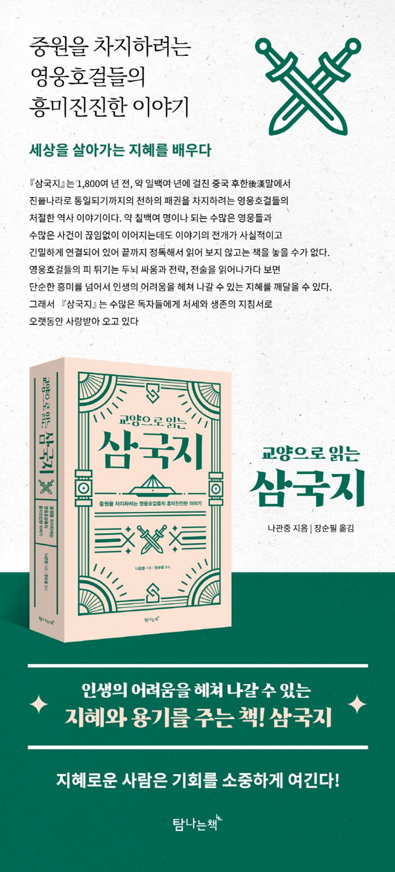 『삼국지』는 1,800여 년 전, 약 일백여 년에 걸친 중국 후한後漢 말에서 진晉나라로 통일되기까지의 천하의 패권을 차지하려는 영웅호걸들의 처절한 역사 이야기이다. 약 칠백여 명이나 되는 수많은 영웅들과 수많은 사건이 끊임없이 이어지는데도 이야기의 전개가 사실적이고 긴밀하게 연결되어 있어 끝까지 정독해서 읽어 보지 않고는 책을 놓을 수가 없다.