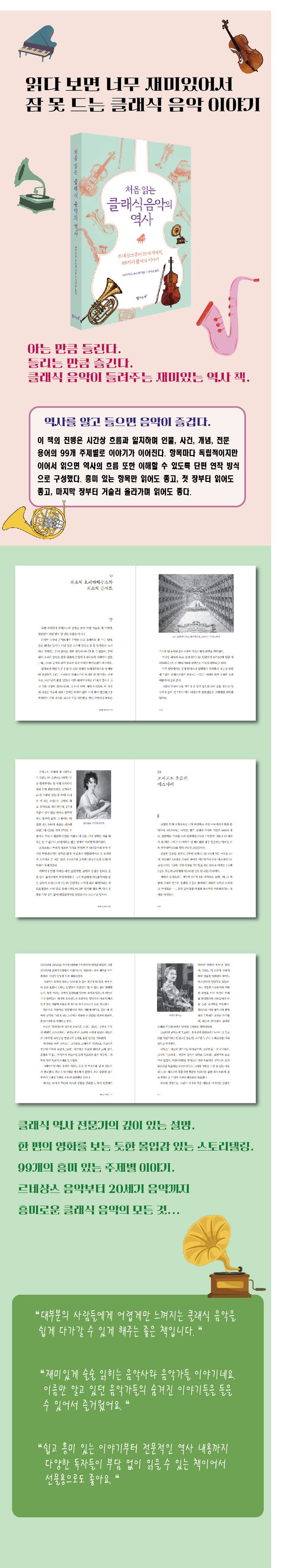 이 책은 넓은 범주의 클래식 음악, 즉 르네상스 시대부터 지극히 최근의 음악까지 담고 있다. 이 책 제목이 ‘처음 읽는 클래식 음악의 역사’인 이유는 단순하다. 대형 음반 매장의 클래식 음악 코너에 놓인 음악 전반을 단권으로 다루기 때문이다. 그레고리오 성가 이후 르네상스 시대 음악을 비롯해 바로크, 고전파, 전기 · 후기 낭만파, 20세기 현대 음악 모두 클래식 음악의 범주에 있다. 이러한 분류에 따라 이 책은 각각의 음악사를 총 6장에 걸쳐 다룬다. 이를 통해 클래식 음악의 역사를 몇 시간 안에 훑어보도록 유도한다.