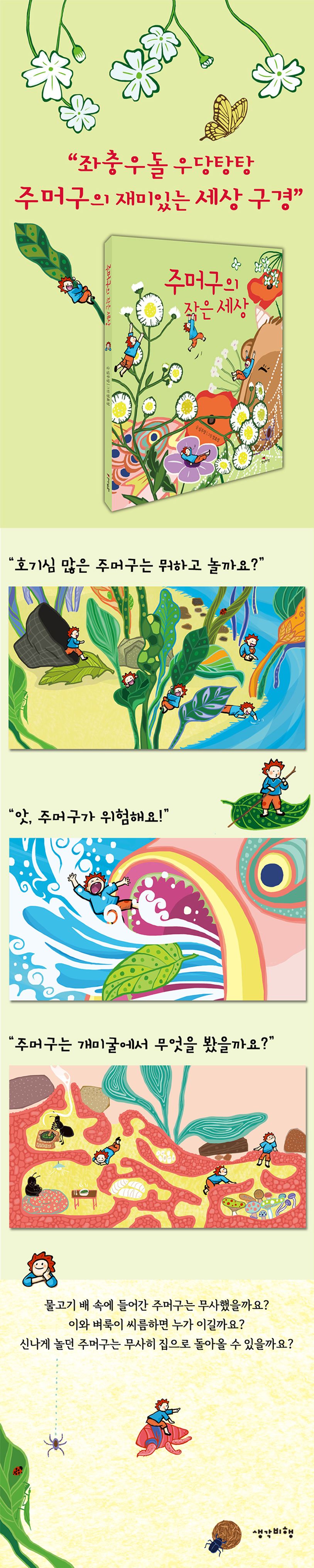《주머구의 작은 세상》은 몸의 크기가 주먹만 해서 ‘주머구’란 이름을 가진 아이의 이야기입니다. 주먹만 한 아이, 주머구가 바라보는 세상은 엄청나게 크고 넓은 데다, 궁금하고 신기한 것들로 가득 차 있지요. 주머구는 아주 작아서 어른의 눈과 귀로는 잘 보이지 않고 들리지 않는 것을 쉽게 알아챌 수 있답니다. 콩알만 한 개미가 무얼 먹는지 개미집을 들여다보고, 눈곱만한 벼룩과 이가 서로 붙들고 무얼 하는지 구경할 수 있습니다. 주위의 큰 물건들 속에 둘러싸여 살고 있는 아이들이 세상의 작은 것들에 호기심을 느끼는 것처럼 말이지요. 이 책은 주머구의 눈을 통해 아이들이 바라보는 세상을 담았습니다.