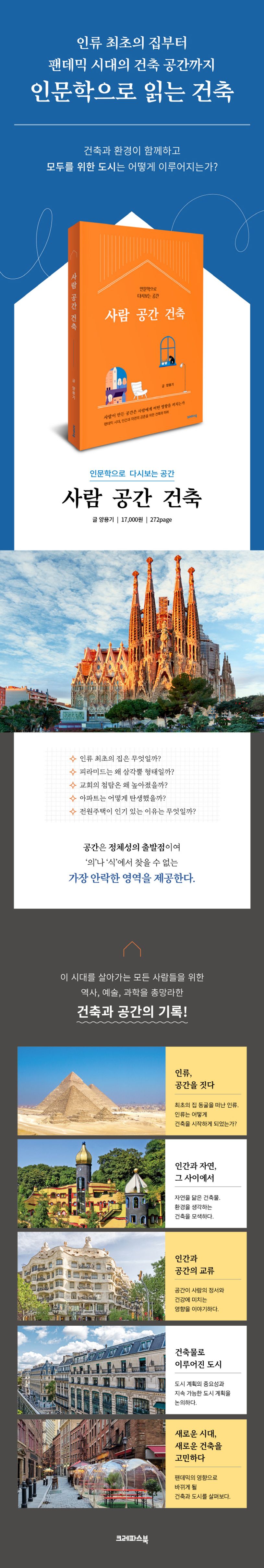 건축은 학문적이고 전문적이라는 생각에 일반 독자들이 접근하기 어려워하는 영역이다. 하지만 건축은 우리가 살아가는 모든 공간에 대한 이야기의 시작점이다. 내가 사는 집에 대한 이야기, 일하는 공간에 대한 이야기, 즐기는 공간에 대한 이야기다. 그리고 아파트는 어떻게 탄생했는지, 피라미드는 왜 삼각뿔 형태인지, 교회의 첨탑은 왜 높아졌는지, 왜 전원주택이 인기인지도 들려줄 수 있는 흥미로운 영역이다.