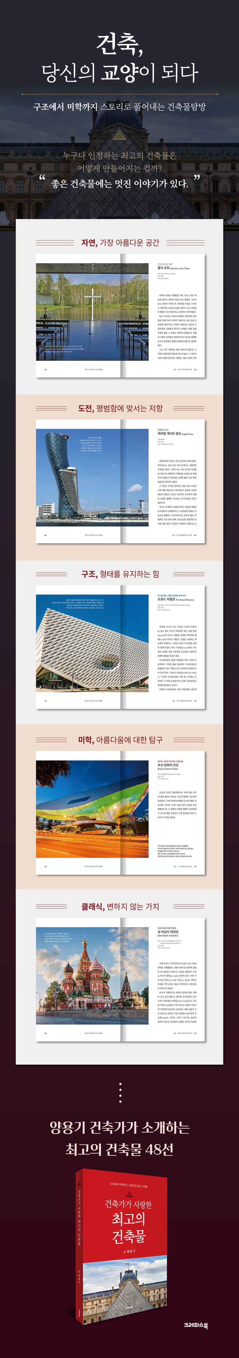 『건축가가 사랑한 최고의 건축물』에는 전 세계 유명 건축물에 대한 지식과 숨은 이야기를 담았다. 책에 수록할 건축물을 선별하는 과정에서 저자는 사회 변화에 영향을 준 작품을 우선적으로 선정하였다. 그리고 이를 단순히 시대별, 사조별로 나열하지 않고 다섯 가지 테마에 따라 구분했다. 1장에서 친자연주의적인 요소의 필요성과 등장 배경을 설명했다면, 2장에서는 시대적 문제점과 관습을 향한 건축가들의 도전과 저항을 다루었다. 3장은 구조에 담긴 미관과 기능을 알려주며, 4장에서는 아름다움을 추구하는 행위와 미의 기준을 이야기했다. 마지막 5장에서는 ‘클래식’의 의미를 통해 고전 양식이 현대에 주는 메시지를 들려주었다. 『건축가가 사랑한 최고의 건축물』은 단순히 건축 지식을 주입하는 것이 아닌, 큐레이터와 함께 전 세계 건축물 투어를 떠나는 느낌을 선사할 것이다.