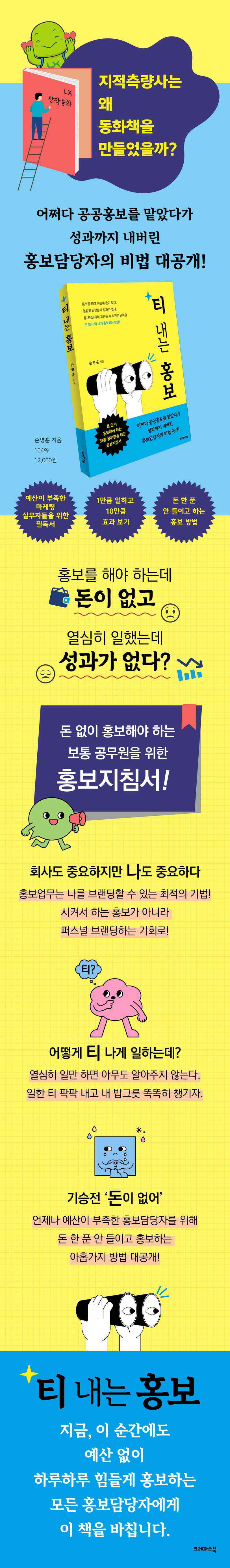 10년 동안 토지의 정보를 국가의 공적 장부에 등록하는 측량업무만 열심히 하던 측량사가 하루아침에 공공기관 홍보담당자가 되어 7년을 버텨냈다. 저자는 국토교통부 산하 공공기관 LX 한국국토정보공사에 홍보담당자로 일하면서 언론홍보, 매체 광고, 간행물 발간, SNS, 유튜브, 대규모 행사까지 공공기관에서 진행하는 홍보업무란 업무는 거의 다 접해본 이른바 ‘만렙’ 홍보담당자다. 공공기관에서 근무하는 홍보담당자라면 누구나 한 번쯤 겪었을 애로사항, 특히 ‘예산’ 때문에 겪는 어려움을 실무자의 위치에서 극복했던 경험과 지식을 갓 홍보담당자에게 전수하고자 한다. 민간홍보와는 다를 수밖에 없는 공공기관의 홍보 방법. 한정된 상황 속에서도 ‘티’ 나게 홍보업무 하는 방법은 무엇일까.